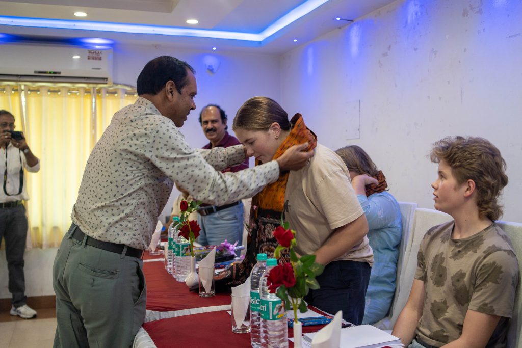 Etter lunsj var det tid for å møte prosjektlederne i regionen vi var i. Først ble vi tatt imot på kongelig vis, med utdeling av blomster og skjerf. Disse skjerfene var laget av mennesker med nedsatt funksjonsevne, som var et tydelig eksempel på et av prosjektene som gav de med mindre i livet en mulighet til å jobbe og tjene penger gjennom trykkunst.